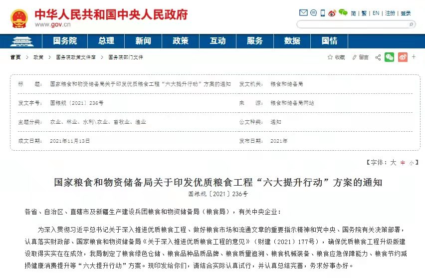 ——《糧食質(zhì)量追溯提升行動(dòng)方案》:到2025年,糧食質(zhì)量安全監測平臺、糧油標準體系、糧食質(zhì)量安全檢驗監測體系和“好糧油”產(chǎn)品追溯技術(shù)規范、追溯標簽標識制度和追溯管理辦法“一平臺兩體系三制度”基本建立,實(shí)現“好糧油”產(chǎn)品責任主體、產(chǎn)品流向、檢驗檢測、監督抽查等信息可追溯和查詢(xún),保障從田間到餐桌的質(zhì)量安全和綠色優(yōu)質(zhì)、營(yíng)養健康。