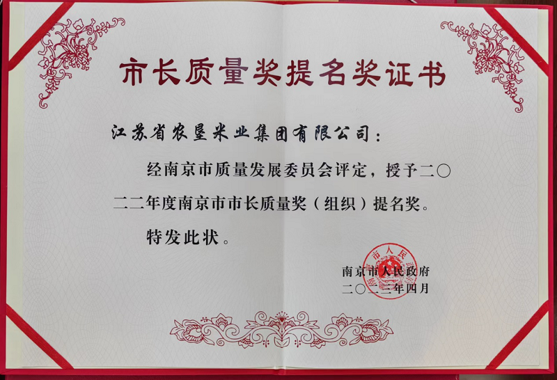 6月2日,2022年度南京市市長(cháng)質(zhì)量獎名單正式揭曉,蘇墾米業(yè)榮獲2022年度南京市市長(cháng)質(zhì)量獎(組織)提名獎。